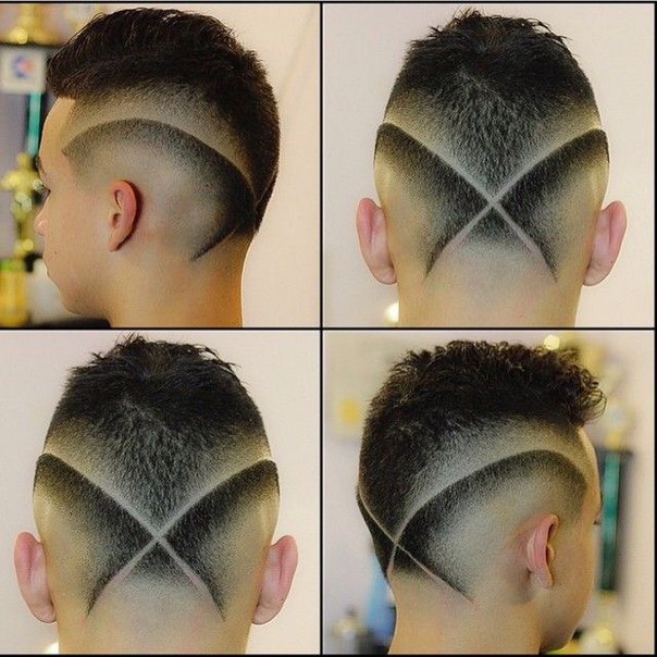Выбирается по желанию клиента. Лучше смотрится на мальчиках от 12 лет. Стрижка ежик, бокс. Также помимо стандартных геометрических фигур, это может быть сердце, звезда или орнамент. - Спортивные символы. Именно благодаря спортивным звездам появились выбритые рисунки. Рисунок может быть выполнен в форме мяча, кубка, футболиста или любимого спортсмена. Актуальны для мальчишек подросткового возраста, эффектно смотрятся на темной шевелюре. Подходит для прически помпадур, андеркат.
