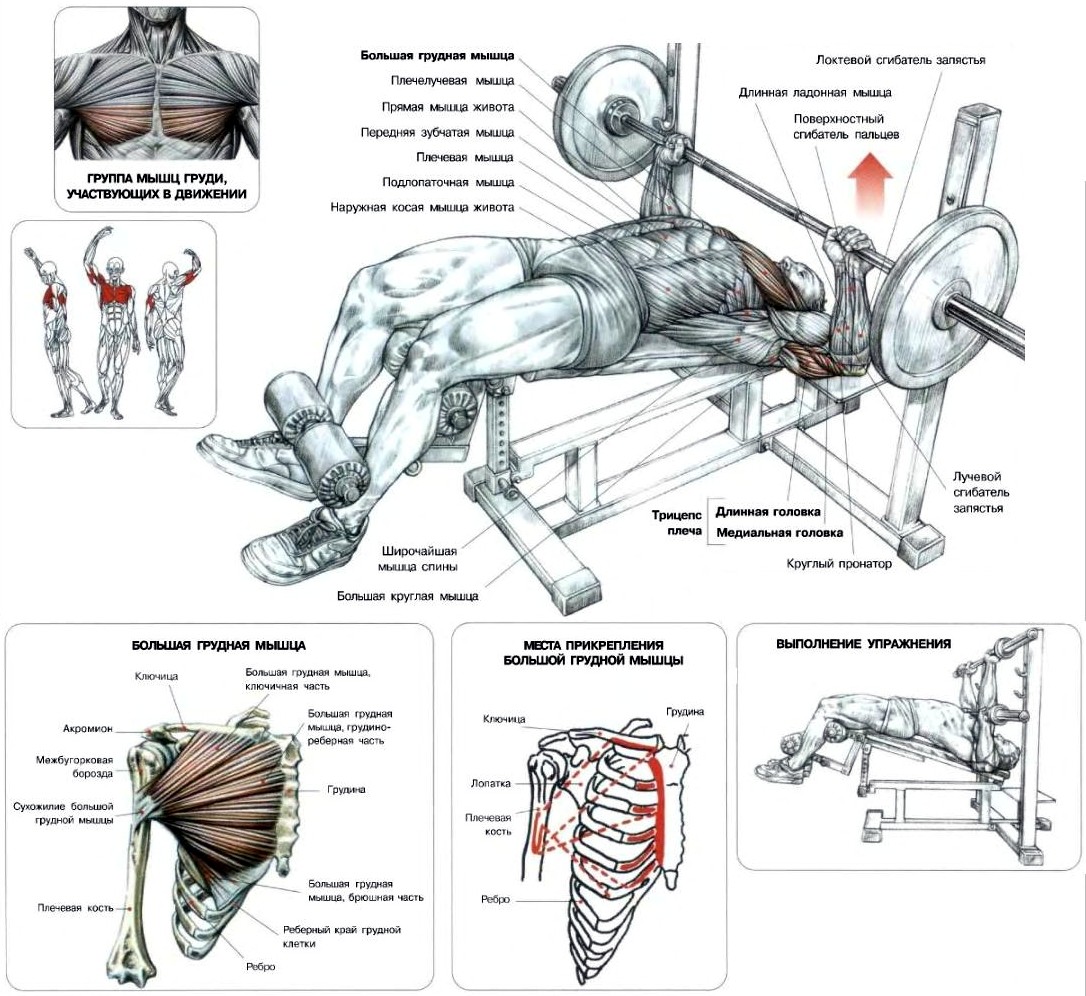 В зависимости от наклона скамьи, в работу вовлекаются разные области внутренней груди.