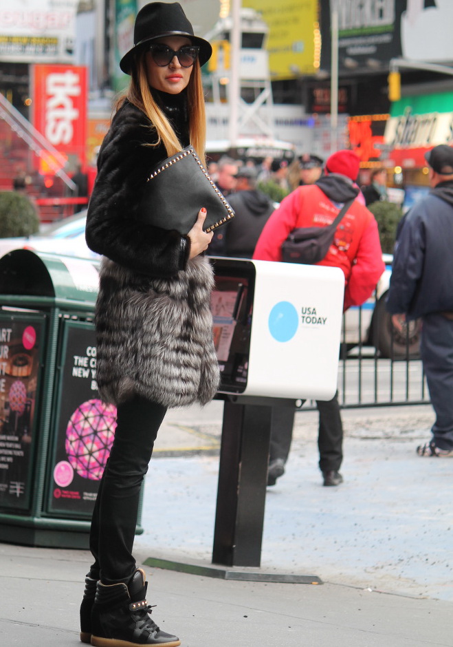 - С шубой. К шубе идеально подойдет шляпа, цвет которой будет совпадать с цветом меха. Она также может быть на пару оттенков темнее или светлее. Также хорошо будут смотреться меховые безрукавки, которым отдают предпочтение современные автоледи.
