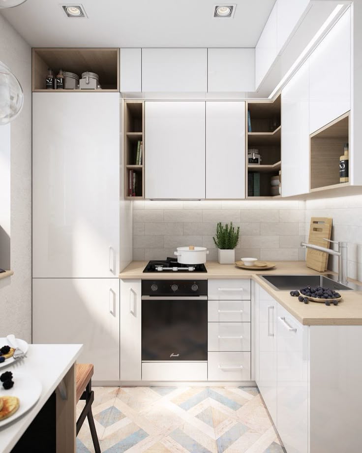 Маленькая кухня — это прекрасная возможность выделиться на полу.