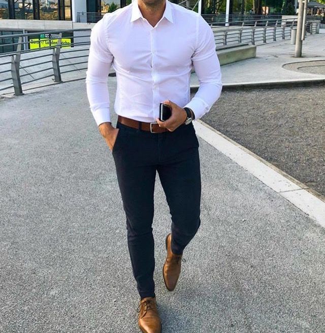 Белая и голубая хлопковая рубашка прямого или приталенного (выбирайте в зависимости от особенностей фигуры) рубашка – основа гардероба мужчины.