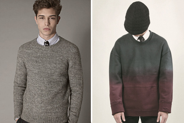 Что касается свитшотов, то нам кажется, лучше в принципе не доставать из-под них воротник. Будучи функционально спортивной вещью, рубашка с воротничком в принципе сильно контрастирует со свитшотом, поэтому лучше не выставлять этот контраст напоказ, а оставить его малозаметным.