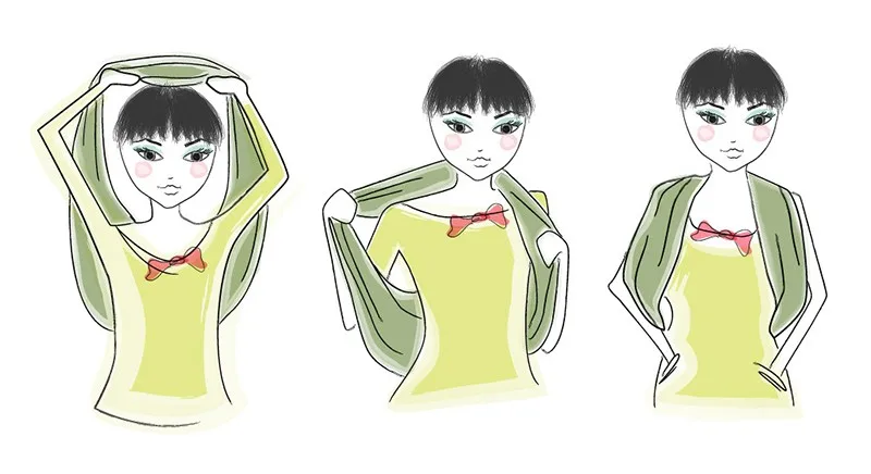 Всего за 10 секунд вы можете превратиться из обычного в гламурный. В этом случае шарф трансформируется в «шаль», которая накидывается на плечи. Вы можете поместить узел спереди или повернуть его в сторону, как вам больше нравится.