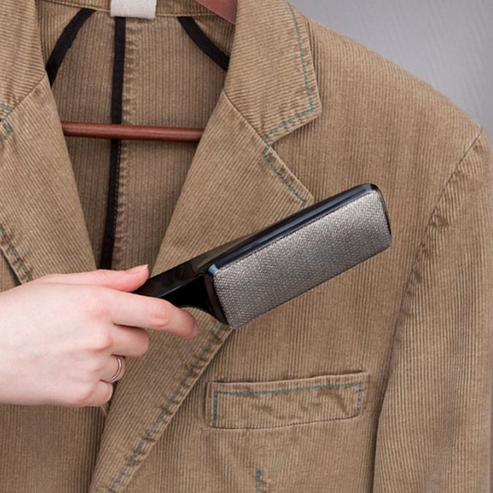 Далее вещь необходимо положить на ровную поверхность, например, стол или повесить на вешалку-плечики в комнате с хорошим освещением. Пальто из любой ткани сначала тщательно очищают одежной щеткой от пыли и мелких ворсинок. Если к изделию прилипло много ворсинок, для чистки применяют щетку с велюровым покрытием.