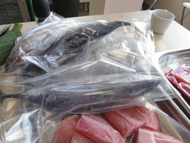 После того, как вы успешно удалили голову и ошейники, положите ахи-тунца вертикально на брюхо.
