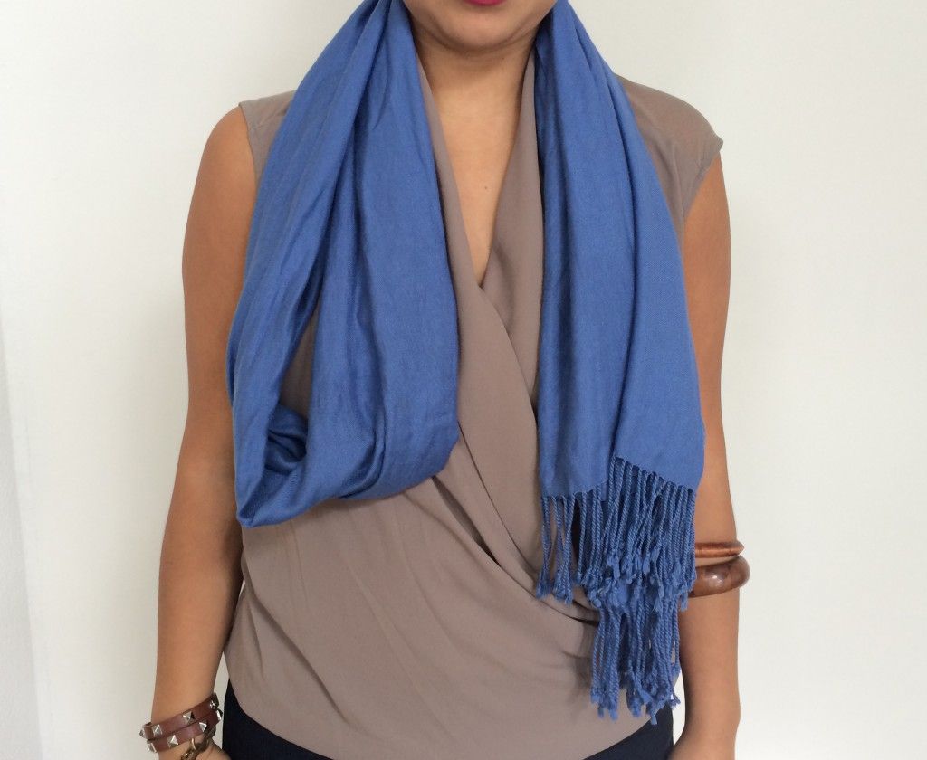 Начните с этого, как если бы вы его драпировали, но вместо этого вы возьмете одну сторону и один раз обмотаете вокруг шеи. Опять же, убедитесь, что стороны хотя бы раз закончены.