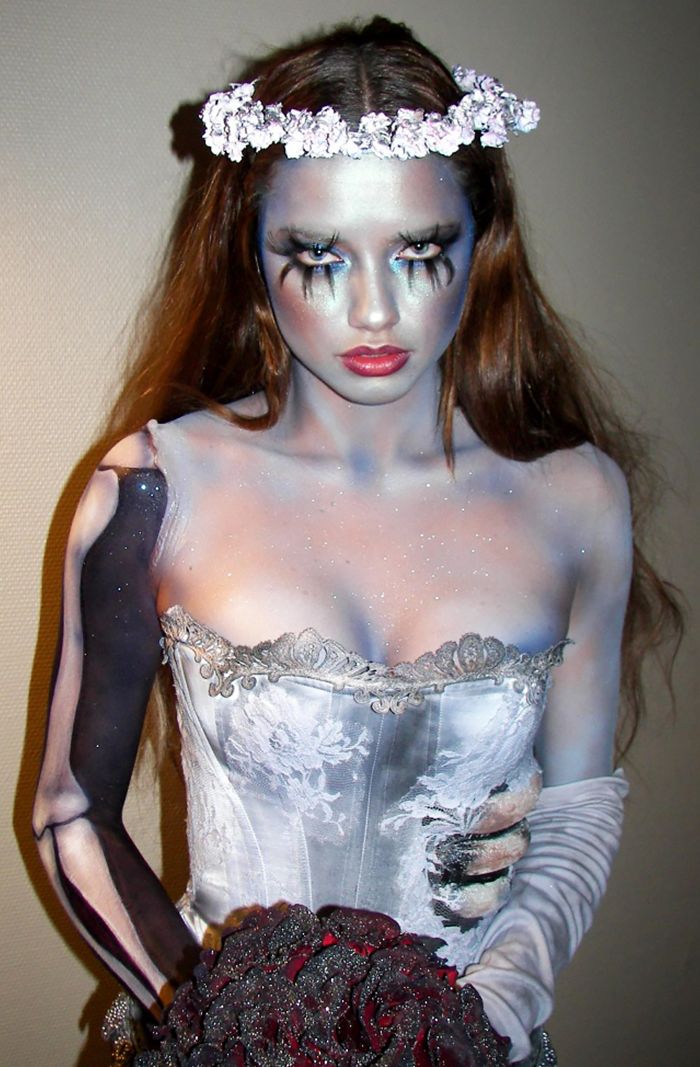 Костюм на Хэллоуин «труп невесты» максимально эффектно будет смотреться с подобающим гримом. Если есть возможность – приобретите голубой, сероватый или белый аквагрим и покройте им все открытые участки кожи. Менее экстравагантный вариант – использовать белую или самую светлую телесную пудру для лица, шеи и области декольте. Ярко выделите глаза, помимо косметики, можно использовать накладные ресницы. По желанию – на лице можно нарисовать ссадины, швы или торчащие кости. Все зависит от вашей фантазии и умений, а также имеющихся под рукой материалов.
