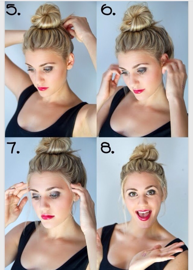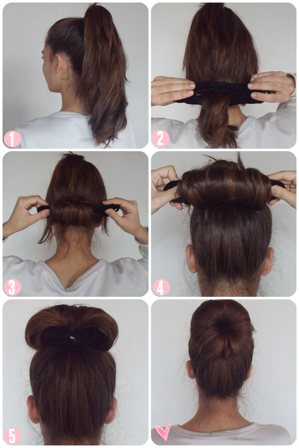- Сделайте высокий хвост сзади, а затем сделайте пучок в виде пончика.