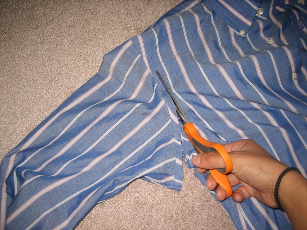 - старые пройменные и боковые швы рубашки нужно разрезать, после этого отрезать излишки материала;