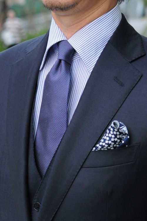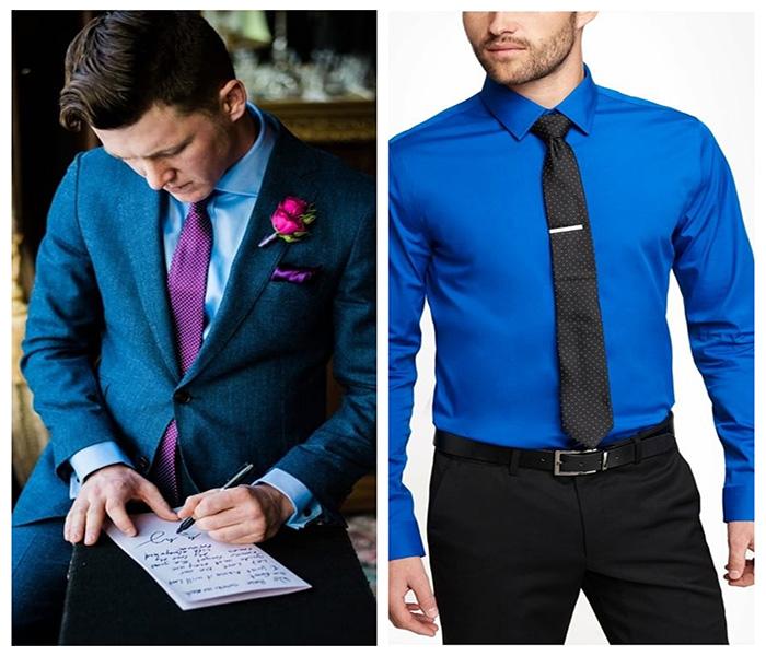 К темно-синему костюму хорошо подходит рубашка стального, небесно-голубого, молочного или лимонного цвета. При этом галстук сюда подойдет красного, желтого, винного или синего оттенка.