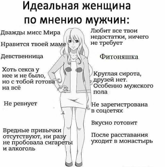 Многие эти установки уже давно устарели, однако в умах некоторых кавалеров всё ещё живут. Смеха ради сравните себя с якобы эталоном жены и пределом мечтаний мужчин.