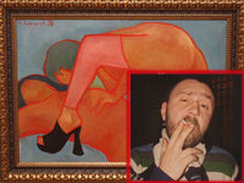 На каждой картине можно найти и узнать либо символ, либо проекцию популярного бренда (от нефти до религии). Картины Сергея Шнурова (фото — ниже) довольно разноплановые и провокационные. Картина «Акт», на которой запечетлено соитие двух тел, или «Не воруй», на которой изображен задавленный насмерть холодильником фирмы «Бош» котенок. Стоит отметить, что размер полотен значителен, свои произведения Сергей подписывает и датирует.