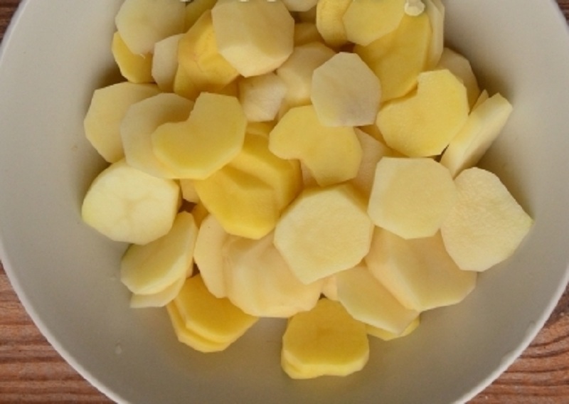 5. Приготовить картофель, нарезав его на кружочки, посыпав приправой и перемешав с растительным маслом.