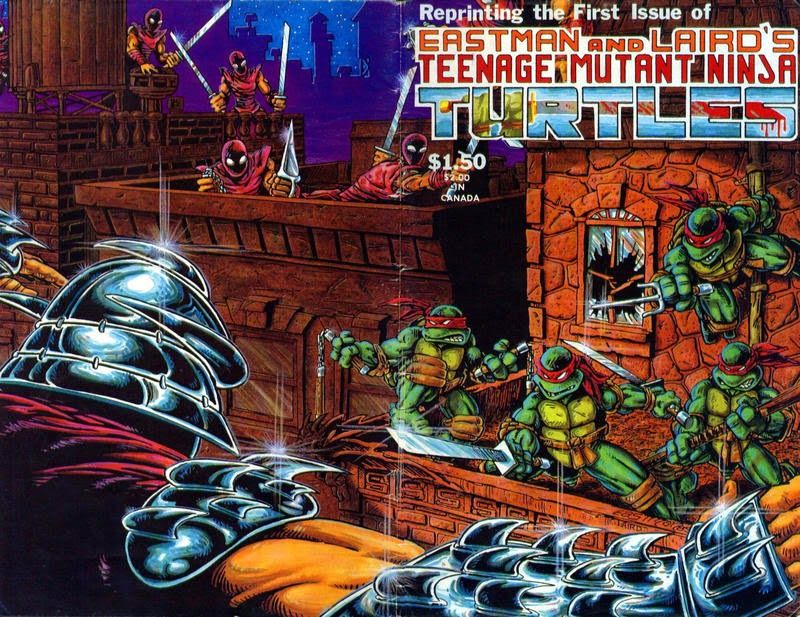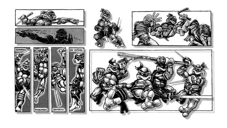 Черепашки Мутанты Ниндзя (Teenage Mutant Ninja Turtles)Концепция возникла из карикатурного рисунка набросала Кевин Истман во время случайного вечера мозгового штурма со своим другом Питер Лэрд. Рисунок короткого, приземистого черепаха носить маску с Nunchakus привязанных к ее рукам был юмористическим к молодым художникам, как он играл на неотъемлемое противоречие медленного, хладнокровный рептилии со скоростью и ловкостью японских боевых искусств . Laird предположил , что они создают команду из четырех таких черепах, каждая из которых специализируется на другое оружие. Истман и Laird часто ссылались на работу Фрэнка Миллера и Джека Кирби , как их основных художественных влияний. Комикс черепашки.