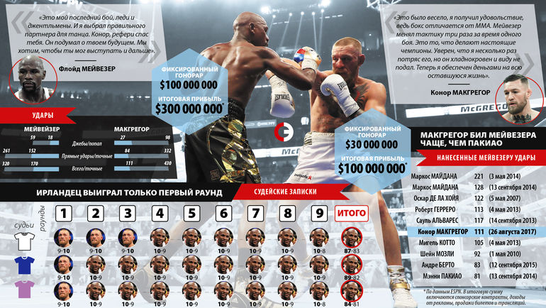 МакГрегор, выигравший 21-3 в октагоне, никогда не боксировал профессионально. Мейвезер, который стремится завершить свой рекорд с идеальным счетом 50-0, возможно, лучший из тех, кто когда-либо надевал перчатки.