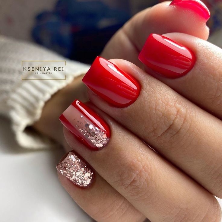 Красный маникюр с блестящим декором