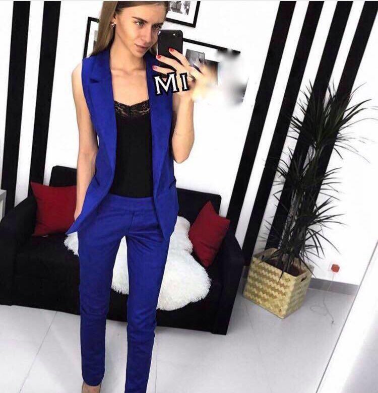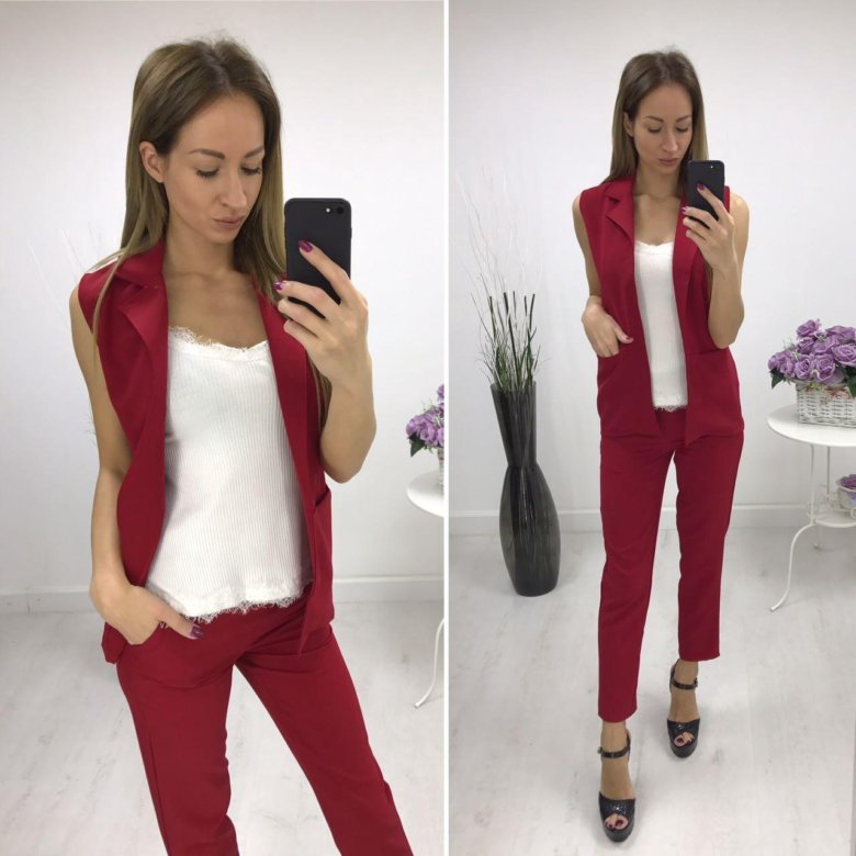 В модных коллекциях можно отыскать огромное количество вариантов брючных костюмов, дополненных жакетом без рукавов. Чаще всего верхняя часть имеет прямой крой и достигает середины бедра.