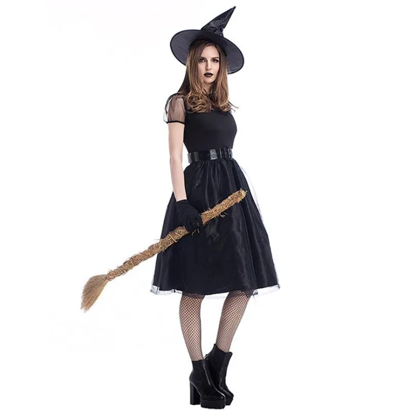Типичная ведьма в длинной сетчатой юбке, с метлой и со старым платком на голове, завязанным бантиком в стиле Солохи из знаменитых «Вечеров на хуторе близ Диканьки».