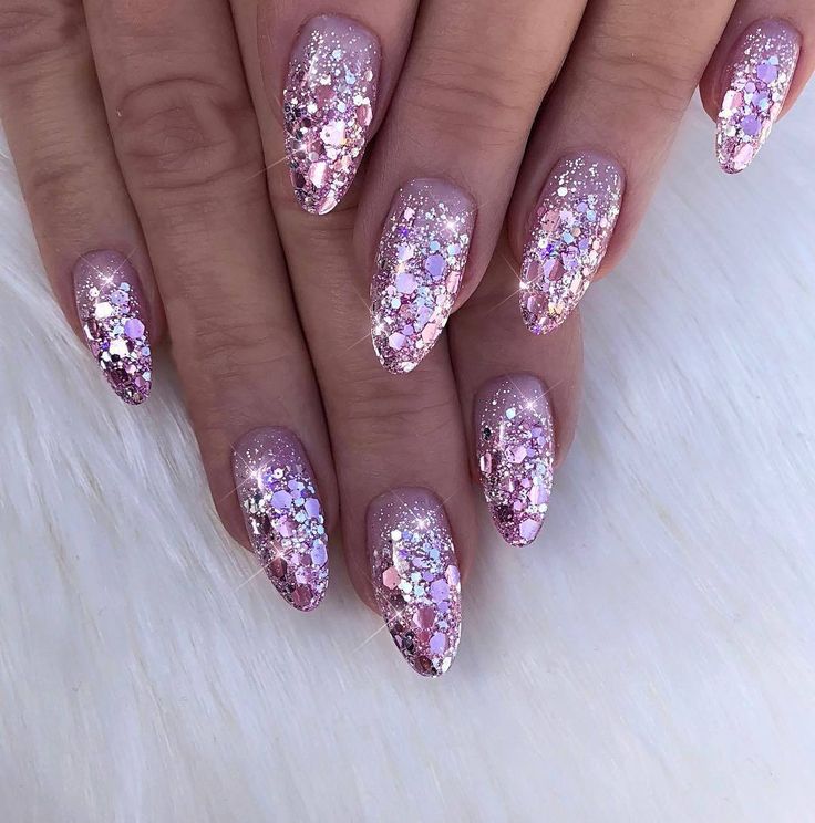 Яркие ногти в форме миндаля – это еще один тренд. Сделай френч с неоновой базой, нарисуй цветы или абстрактные формы – и ты королева стиля. Само собой, подойдет «морское стекло» – как на фото ниже.