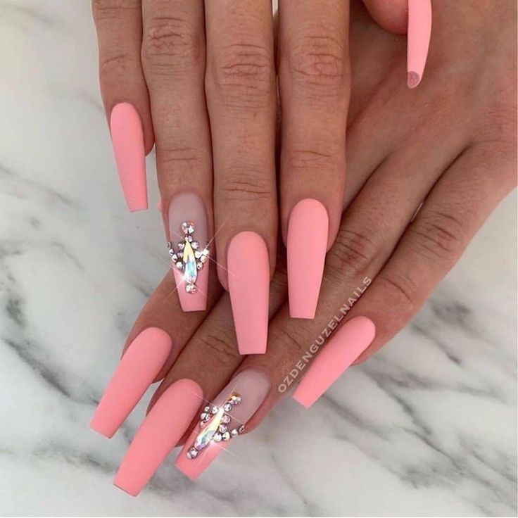 Этот дизайн имеет нежно-розовые ногти, но есть небольшой акцент на безымянном пальце каждой руки. Вокруг кутикулы есть U-образные драгоценные камни, которые выглядят так, как будто они окружают палец, как кольцо. Этот дизайн лучше всего подходит для длинных ногтей.
