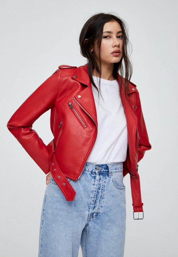 Утонченная куртка-жакет красного цвета из натуральной кожи в минималистичном дизайне с ультрамодной асимметричной застёжкой прекрасно дополнит смелые офисные, а также неформальные повседневные комплекты