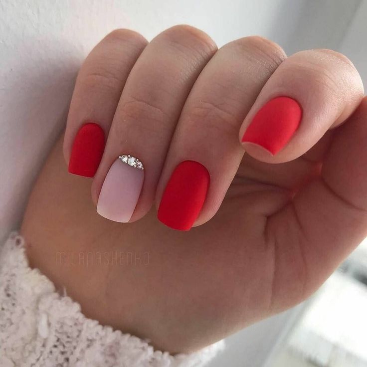 Красный матовый маникюр превосходно сочетается с разными техниками и цветами. Более глубокие оттенки красного лака используйте в осенне-зимний период, а алые тона подойдут для весенне-летнего времени.