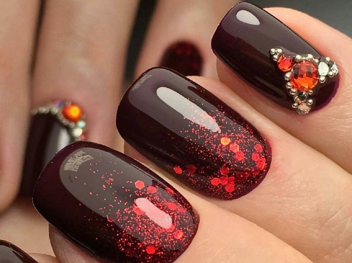 Блестки в сочетании с красным лаком – неизменно популярная идея для вечернего маникюра. Но и повседневный может включать в себя такой элемент. Так, сдержанные оттенки красного – бордо, сангрия, кардинал, гранат и др. – дополненные небольшими акцентами из блесток, приобретают яркую индивидуальность и даже дерзость.