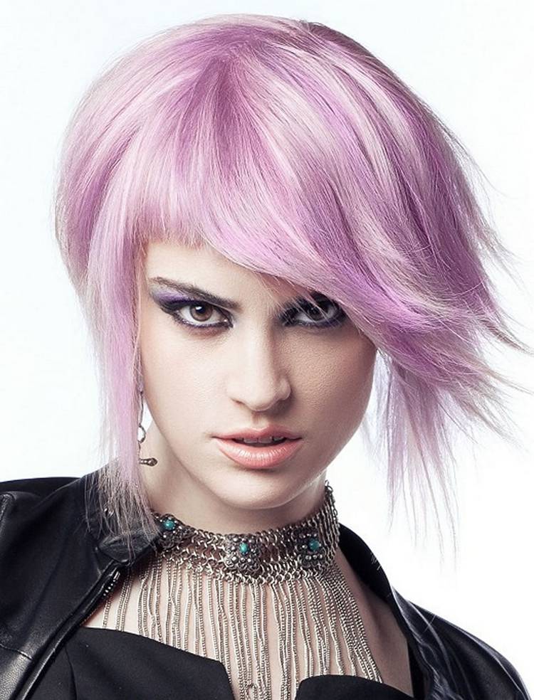Отдельные локоны или виски можно покрасить лиловым оттенком, при этом основную массу волос любым оттенком блонда, кстати, модного в этом сезоне тренда.