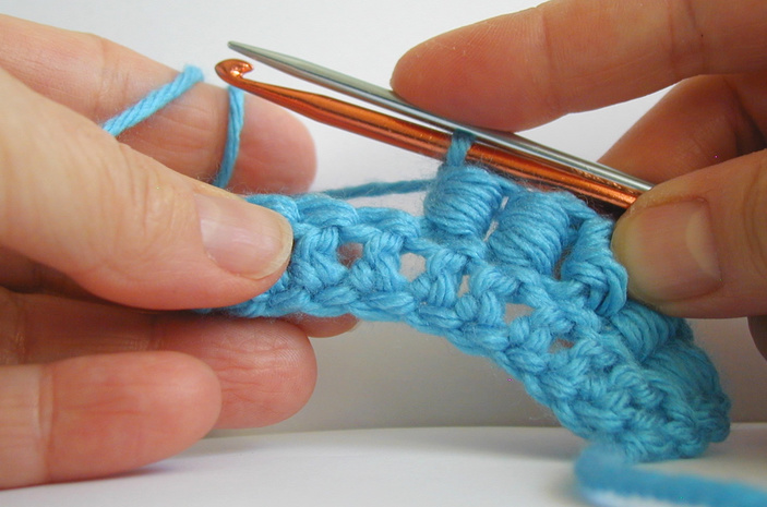 При вязании крючком рабочая нить придерживается большим и указательным пальцами левой руки. Крючок держится в правой руке большим и указательным пальцами с опорой на третий палец. Нить набрасывается на крючок, продетый в свободную петлю, и вытягивается через нее. Основные типы петель в вязании крючком: воздушная, полустолбик, столбик с накидом, столбик без накида.