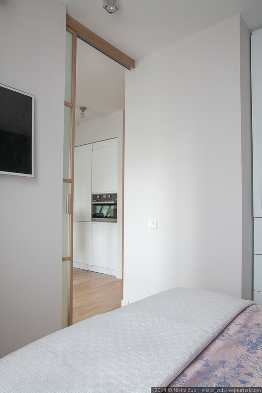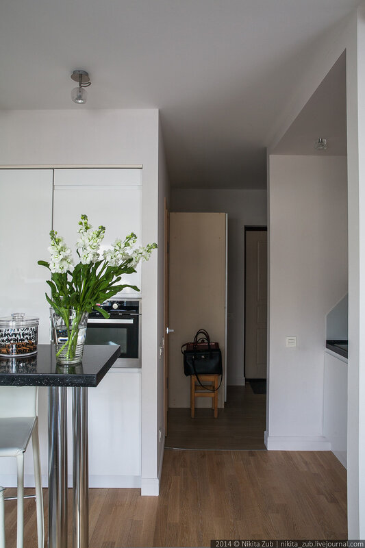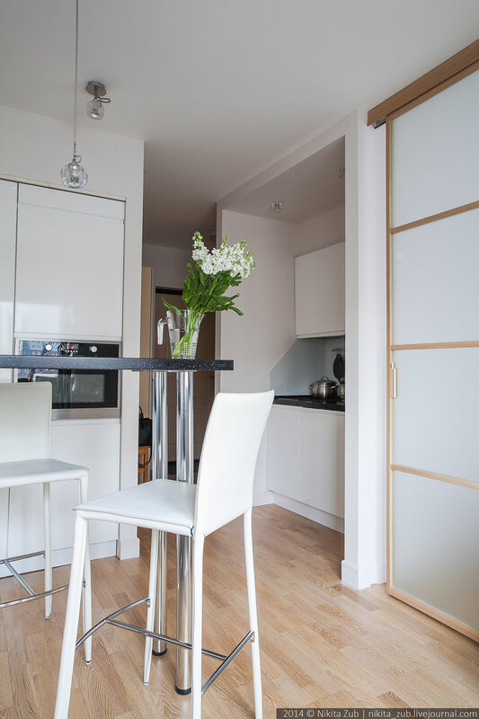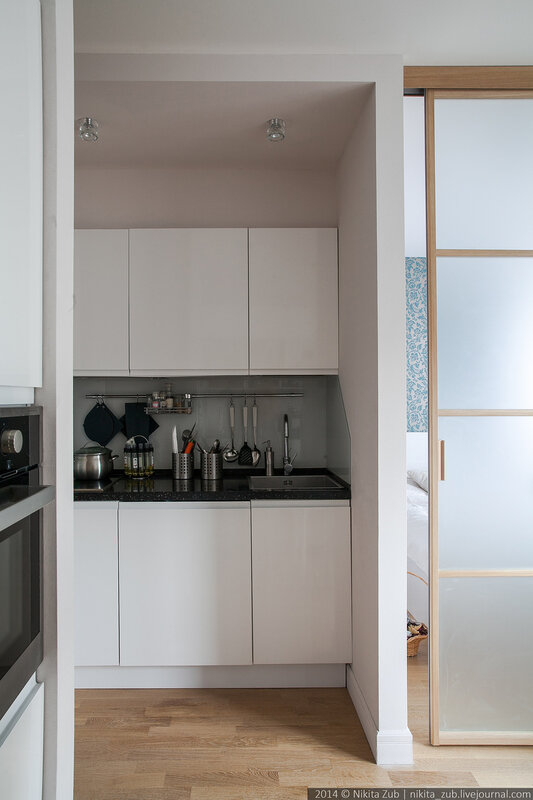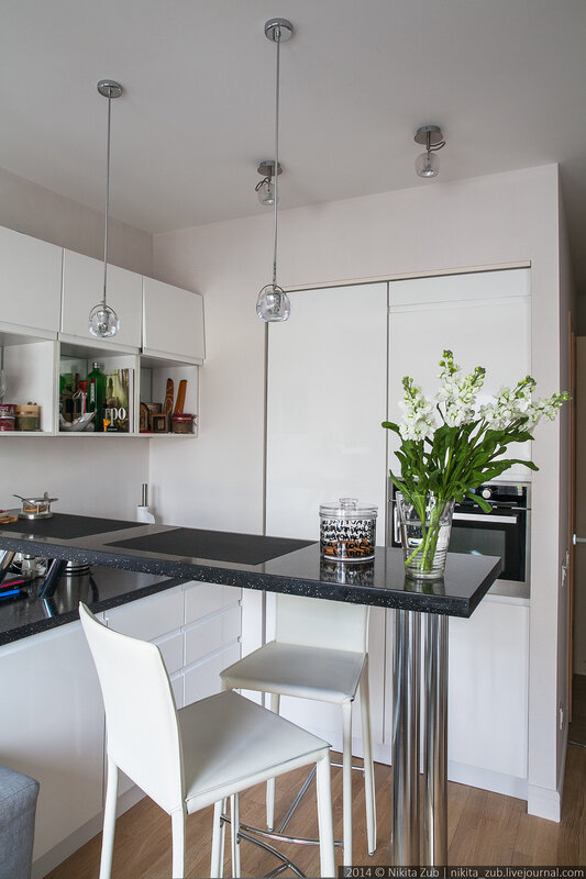 Поскольку площадь квартиры невелика, дизайнер старалась использовать каждый свободный сантиметр при планировке студии. Также необходимо было сохранить ощущение простора, поэтому в кухне решили отказаться от навесных шкафов, сильно «зажимающих» пространство, и свести количество бытовой техники к минимуму.