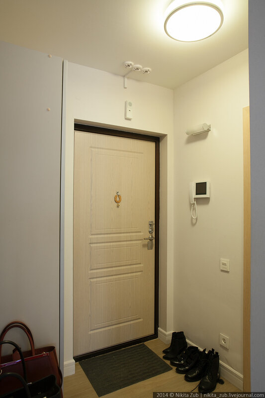 В квартире изначально была небольшая перегородка, отделяющая входную часть от жилой комнаты. Для начала ее убрали, а затем на этом месте выстроили новую, немного увеличив при этом площадь прихожей. Перегородку в квартире поставили таким образом, что она образует две ниши – одна направлена в сторону спальной зоны, а другая – в прихожую. В этих нишах разместились системы хранения для одежды, обуви и других необходимых в хозяйстве вещей.