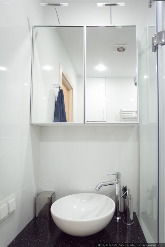 Для экономии места можно установить навесную раковину, под которой будет пространство, например, для корзины для белья или раковину в комплекте со шкафом. Существует множество вариантов навесных панелей с зеркалами для хранения полотенец и других предметов гигиены.