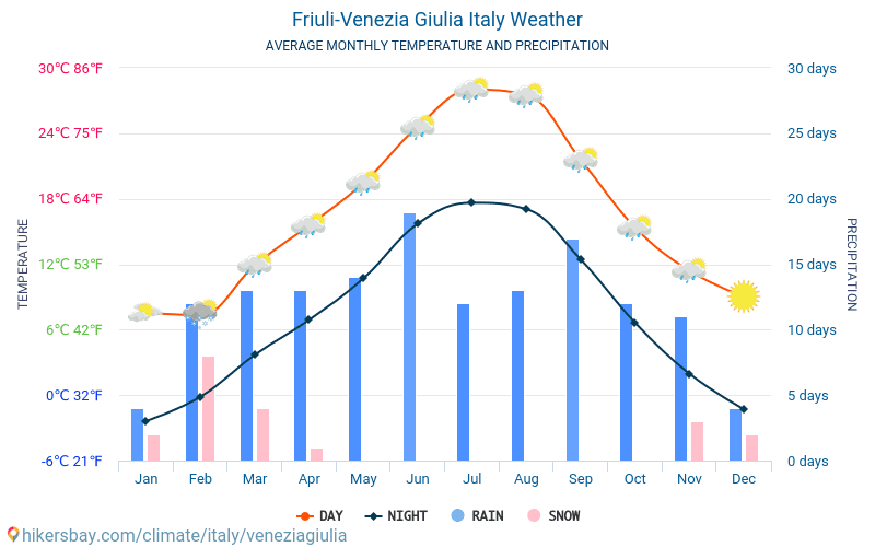 Она может быть относительно мягкой, а могут идти сильные ливневые дожди, сопровождаемые ледяными арктическими ветрами. Часто небо затягивает серыми тучами. Солнце появляется на небе не более на 3-4 часа в день. Дневная температура воздуха колеблется от 6 °С до 8 °С. Последний зимний месяц – самый тёплый. Если в декабре на улицах Венеции довольно тихо, то в январе создаётся впечатление, что попадаешь на необитаемый остров. В феврале, несмотря на ненастную погоду, Венеция проводит карнавал.