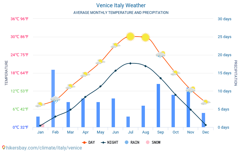 Лето в Венеции более умеренное (высокие 70-е и 80-е годы), чем в знойных городах Италии. В большинстве венецианских отелей есть кондиционеры, что важно летом, но они обычно доступны только с мая (самое раннее) по сентябрь. Весна и осень могут быть прохладными, и многим отелям — благодаря национальному интересу к экономии энергии — не разрешается включать отопление до зимы.