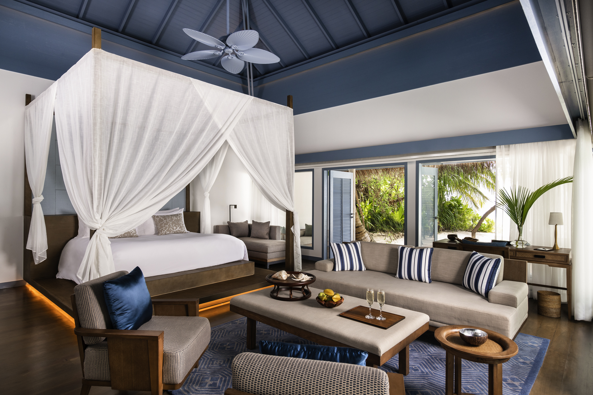 пляжные виллы и резиденции, а также 16 больших надводных вилл обставлены мебелью в колониальном стиле. Есть также жалюзи и потолочные вентиляторы, веранды и тонкие драпировки вокруг кроватей с балдахином.Кроме того, полосатые темно-синие подушки и небесно-голубой/белый пейзаж дополняют сказочный ультрамариновый океан, который открывается из каждой виллы.