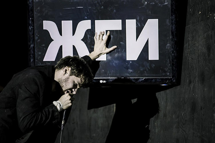 «Очень печальная ситуация»: пьеса по мотивам суда над Кириллом СеребренниковымЕсли отвлечься от остроты и дикости контекста, то можно увидеть целостную, концептуально самоценную структуру. Правила игры заявляются в прологе; место действия — неопрятный привокзальный буфет с металлическими скамейками и стоячими столиками. На стены, строфа за строфой, проецируется пушкинский «Пророк». Вокруг — старушки с сумками, полицейские с дошираком, буфетчица со сканвордом, на экране нависающего телевизора — «Вести 24». Бытовую гармонию нарушает «шестикрылый серафим» в виде обнаженного атлета; никем не замечаемый, он мистически скачет по залу, хватает самого незаметного из присутствующих — томимого «духовной жаждой» хмурого парня — и живописно и с брызгами крови вырывает ему сердце. На освободившееся место, согласно пушкинским строкам, ангел «водвинул» «угль, пылающий огнем». Хрестоматийное завершение стихотворения о высшей миссии поэта — «Глаголом жги сердца людей» — прерывается гигантским титром «ЖГИ». Два последующих акта спектакля — не что иное, как тяжелый трип этого самого парня в исполнении Филиппа Авдеева в пальто с поднятым воротником.
