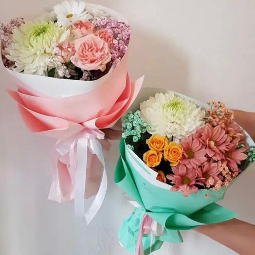Если же цветы выступают в роли самостоятельного подарка, ситуация меняется — допускается более сложное сочетание бутонов с ярким оформлением. Даже такие букетики бывают экспрессивными.