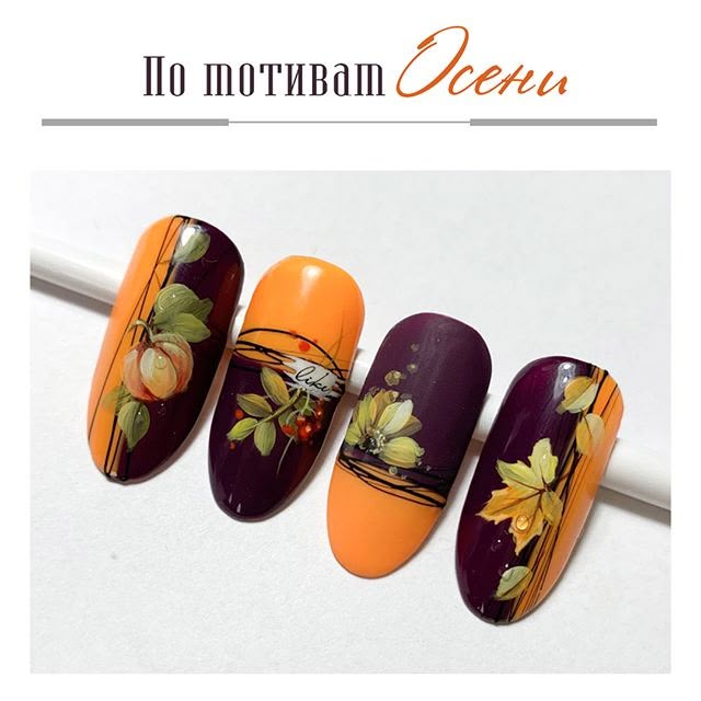 д.) . В результате получаются полноценные композиции на тему осени. Примеры маникюра с рисунками на тему осени вы можете посмотреть на фото ниже.