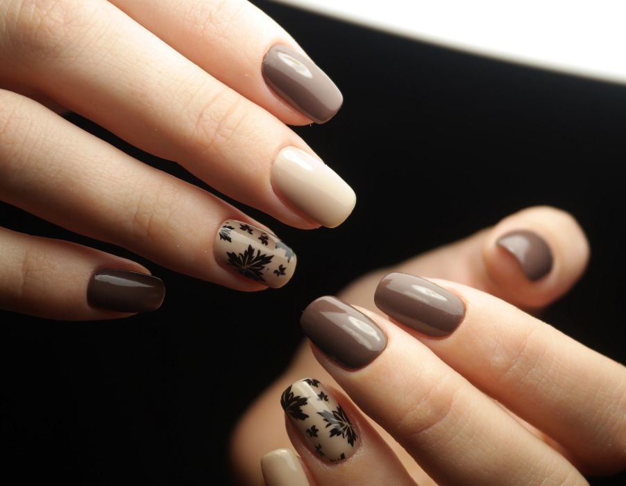 Растительная тематика становится актуальной в прохладный сезон. Это маникюр с узором в виде листьев: