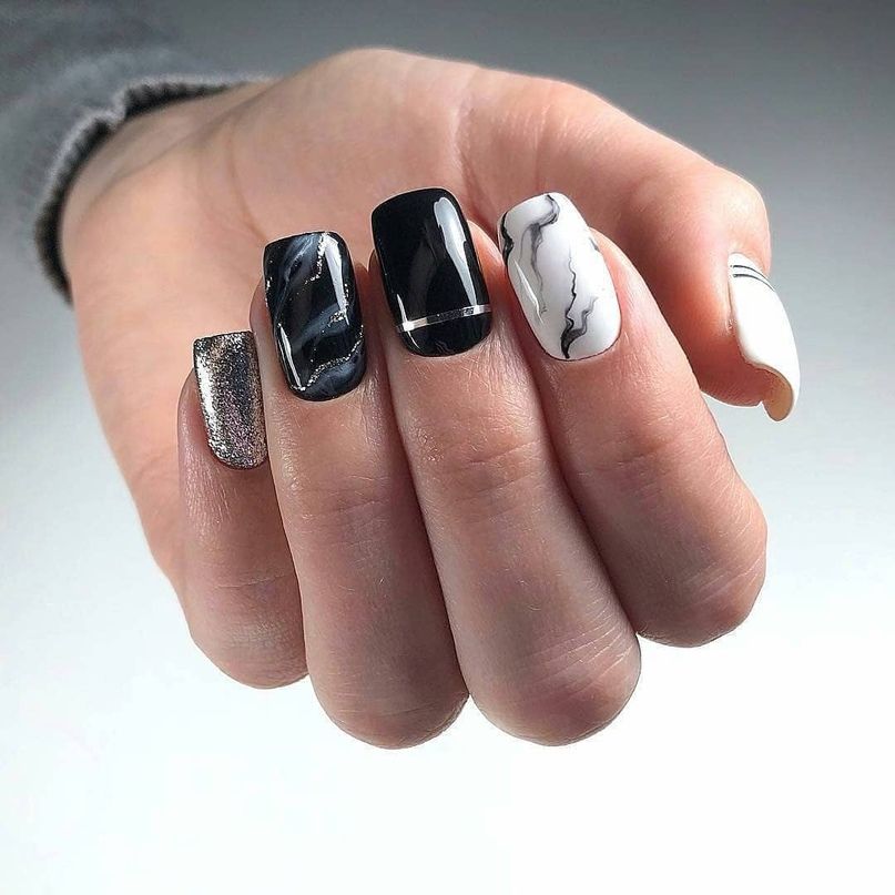 Сам по себе чёрный маникюр не создаёт угнетающее впечатление, скорее наоборот, он дарит рукам нарядность и воздушность. А классический вариант комбинации чёрного с белым – это образ, подходящий к любому случаю. Французский или лунный маникюр в таких цветах можно считать классикой жанра. Очень удачно в таком маникюре смотрится игра не только на контрасте цветов, но и фактуре поверхности. Так, сочетая белый матовый цвет и чёрный глянец можно добиться очень нарядного и нестандартного дизайна.