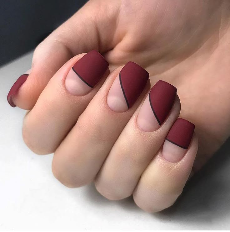 Интересно смотрятся короткие красные матовые ногти с необычным узором или геометрическим рисунком.