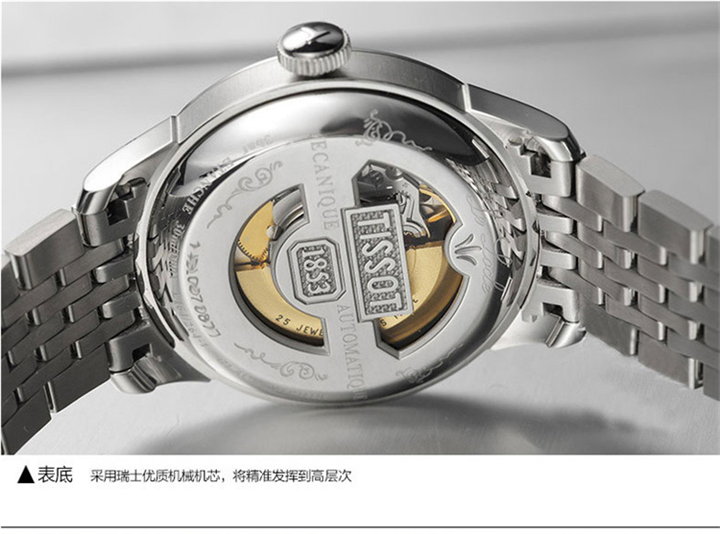 Особенности: Корпус из нержавеющей стали Кожаный ремешок Автоматический механизм Калибр: ETA 2671 25 камней Сапфировое стекло Серебряный циферблат Аналоговый дисплей Отображение даты Прозрачная задняя крышка Застежка-пряжка Водонепроницаемость 50 м Приблизительный диаметр корпуса: 30 мм Приблизительная толщина корпуса: 10 мм Приблизительная ширина ушка: 15 мм