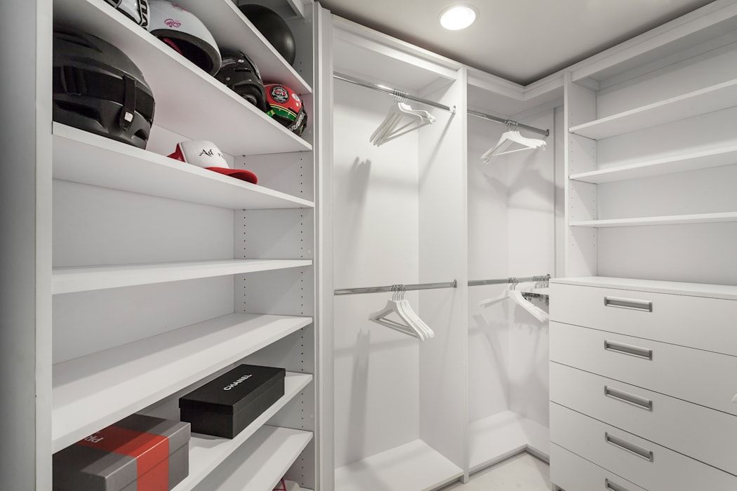 дизайн встроенной компактной гардеробной комнаты с множеством полок, стеллажей и выдвижных ящиков