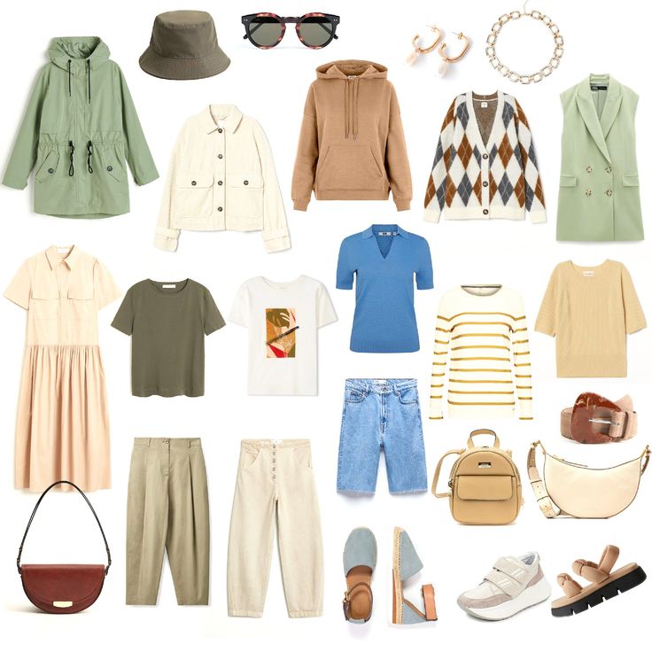 Платье –рубашка, платье-сарафан, светлые брюки, шорты из денима, футболки, бретонка, ветровка, купальник, кеды или кроссовки, сандалии, солнечные очки и балетки.