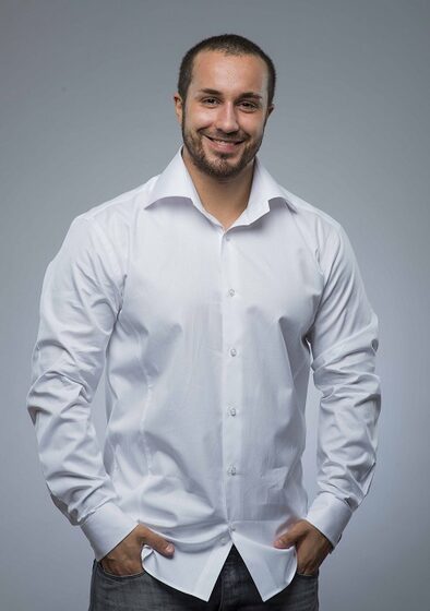 Taillenaufnahme eines jungen Mannes im blauen Hemd, der über weißem Hintergrund in die Kamera schaut