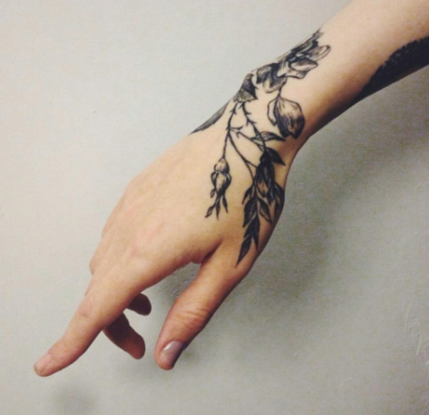 Тату на тыльной стороне руки не так популярны у девушек, как на запястье, но и не занимают последнее место. Эта часть руки не так заметна и выбирается, чтобы не афишировать тату.Популярными являются осмысленные фразы на разных языках, цветы или животные.
