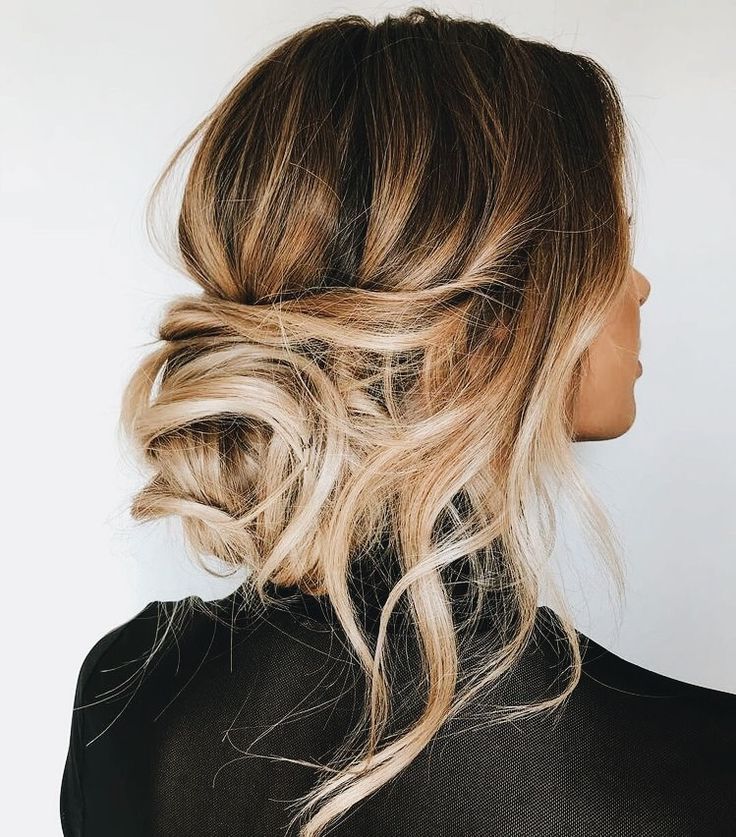 Низкий распущенный пучок на боку — это растрепанные волосы во всей красе.