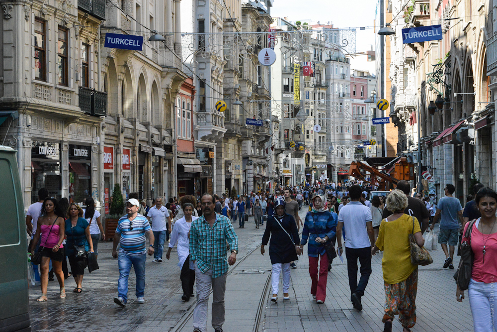 И если поначалу, со вьездом через Галатский мост, архитектурные пейзажи еще напоминают азиатский Стамбул, то на подходе к торговой артерии новой стороны — улице Истикляль — атмосфера резко меняется. Теперь ты находишься как будто в центре Берлина, где в дизайнерских магазинах, андерграундных барах и арт-кафе кишит жизнь тусовочных местных. По Истикляль можно проехаться на старинном трамвае, но только в случае смертельной усталости. Протяженность улицы почти 2 километра и эти два километра поражают своей насыщенностью. Поют уличные музыканты, танцует молодежь, во всю идет торговля, а мороженщики мнут мягкое турецкое морожное «дондурма», постукивая длинными палками и проворачивая хитрые фокусы с покупателями. Вечером Истикляль, перетекающая в известную площадь Таксим, очень уютна — в большом потоке людей просто интересно идти и глазеть по сторонам, в ожидании когда старый медленный трамвайчик разделит толпу и соберет мальчишек на своих лесенках.