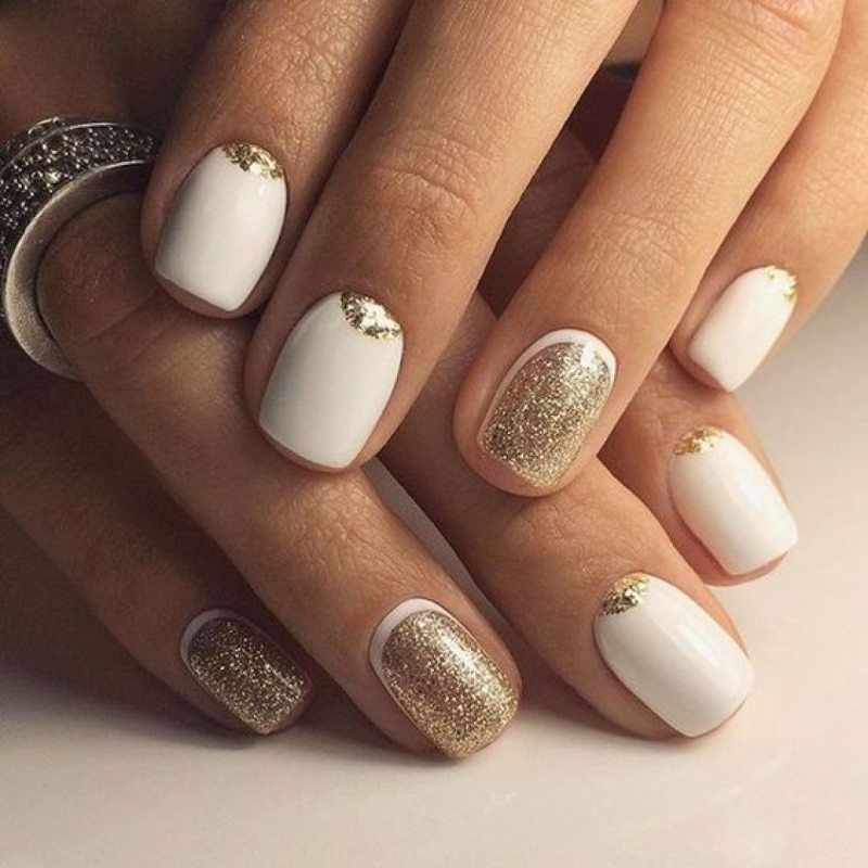 Это именно то, что вам нужно, если вы ищете гламурный вариант. Серебро и золото идеально сочетаются с белым цветом ногтей, но вы также можете попробовать другие оттенки блеска, такие как розовое золото. Такой вид дизайна выглядит очень женственно и роскошно. Он не только сделает вашу повседневную жизнь ярче, но и завершит образ для особого случая.