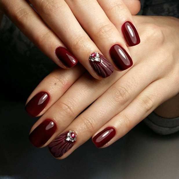 Теплые весенне-летние цвета маникюра, отступают на второй план, давая раскрыться холодным насыщенным оттенкам. Поэтому черные и темно-синие ногти не являются неожиданной тенденцией. Классический ярко-красный также трансформируется в более модные оттенки — бордовый и вишневый.